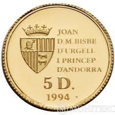 Золота монета 5 динерів 1994 року. Андорра. Червона білка