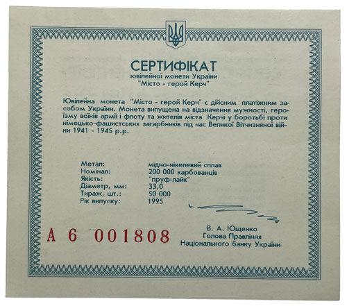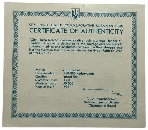Сертифікат до монети 200000 карбованців 1995 рік Місто герой Керч