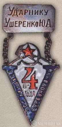 Нагрудный знак «Ударнику соцсоревнования. Пятилетку в 4 года». 30-е гг.