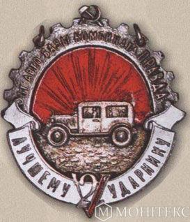Нагрудный знак «Лучшему ударнику 2-й пятилетки. От автобазы комбината "Правда"». 1933 г.