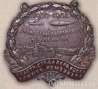 Нагрудный знак Жетон в честь завершения строительства Волховского алюминиевого комбината. 1932 г.