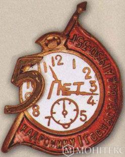 Нагрудный знак в честь 5-летия Первого государственного часового завода. 1935 г.