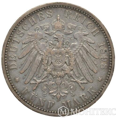 Серебряная монета 5 Марок 1898 год. Вюртемберг
