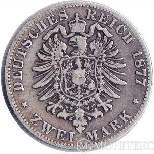 Серебряная монета 2 Марки 1877 год. Пруссия