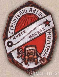 Нагрудний знак «будівельнику автомагістралі Мінськ - Москва» . 30-ті рр.