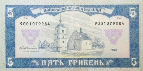 5 гривень 1992 року, підпис В. Гетьман, aUNC, № починається з 9