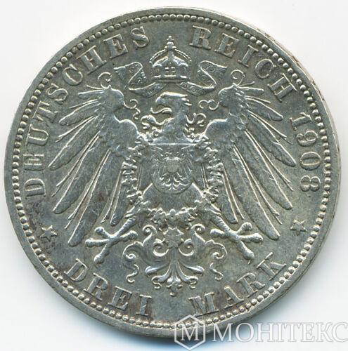 Срібна монета 3 Марки 1908 рік. Пруссія