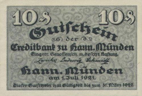 Банкнота 10 пфенігів 1921 року, Нотгельд, Ганн. Мюнден (Hann. Münden), UNC