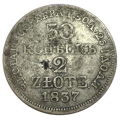 30 копійок 2 злотих 1837 року MW (для Польщі), Микола I, VF