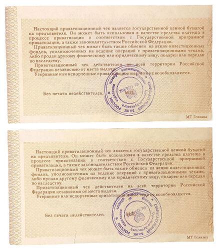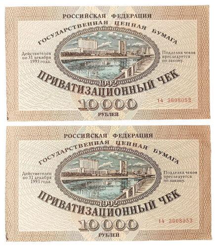 10000 рублів 1992 року, приватизаційний чек, 2 шт, XF